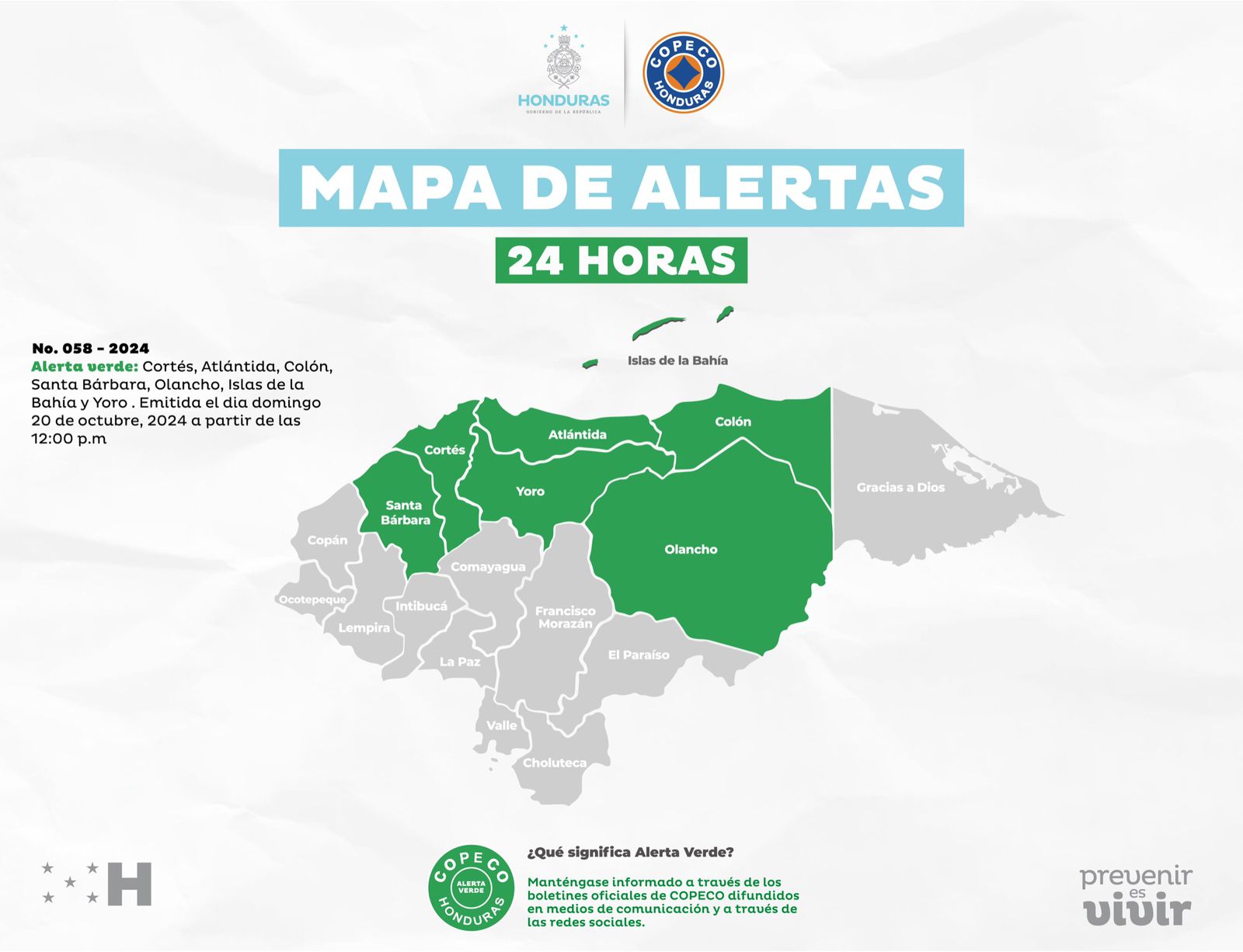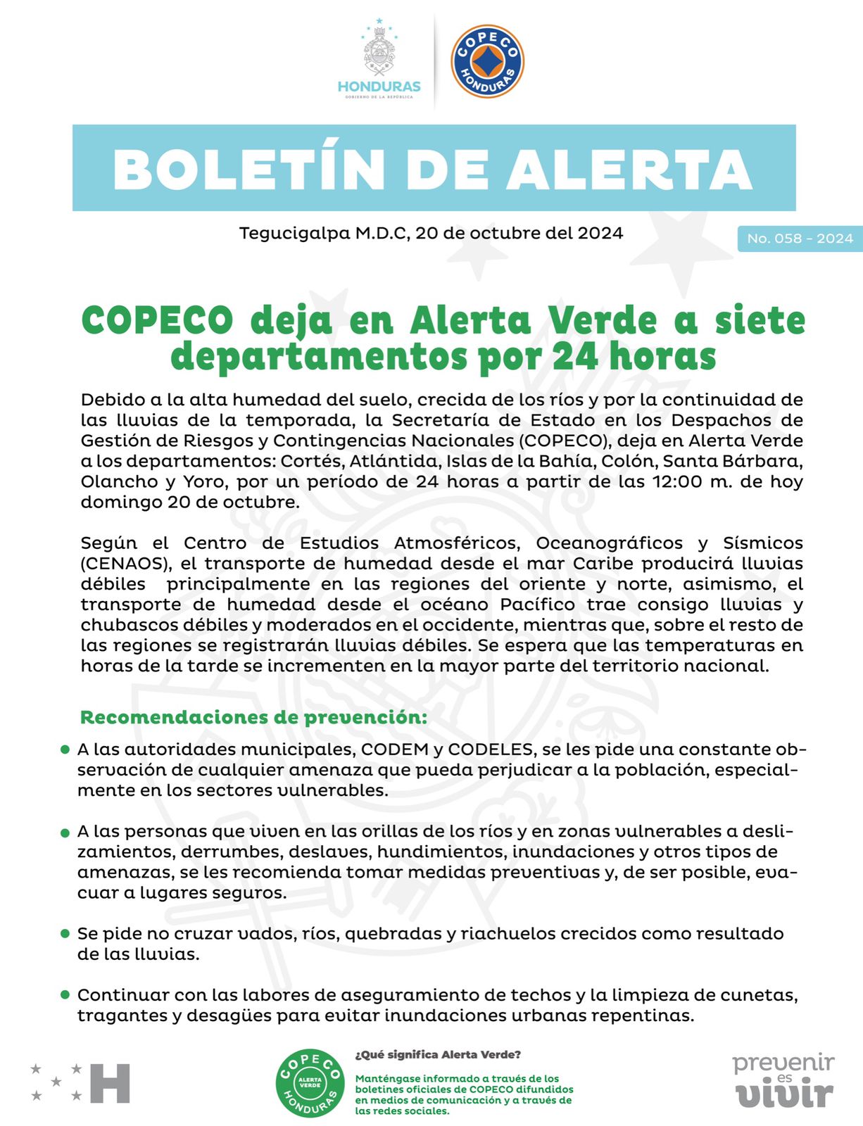 las lluvias de la temporada, la Secretaría de Gestión de Riesgos y Contingencias Nacionales (Copeco) decretó dejar en alerta verde a siete departamentos de Honduras.