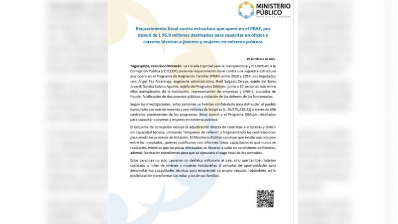 Le puede interesar – Desvío de más de 96 millones: MP acusa a estructura corrupta que operó en el PRAF