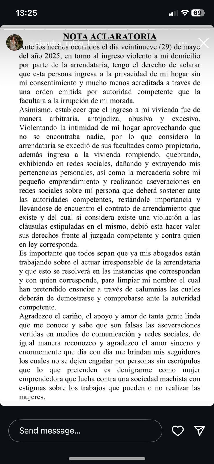 Farándula. La influencer y expresentadora de televisión Alejandra Rubio rompió este sábado el silencio tras la denuncia pública de su arrendadora, quien la acusó de no pagar el alquiler de su vivienda.