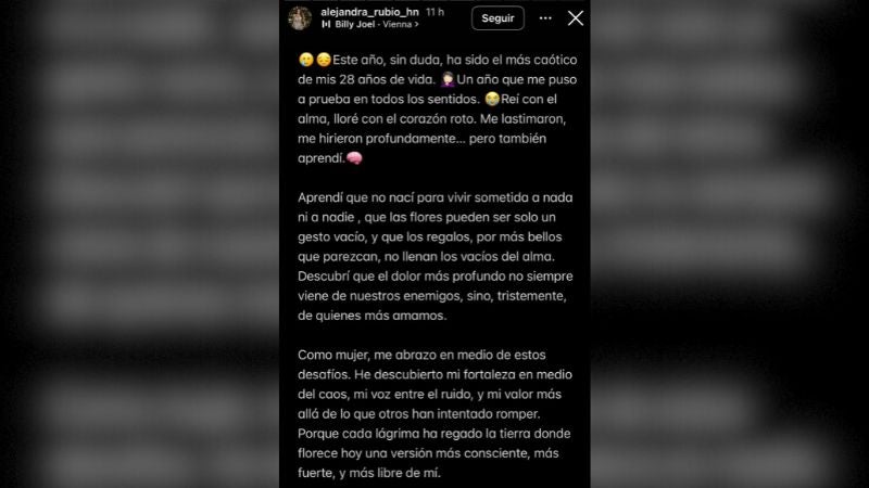 «Hay muchas cosas por contar… pero aún no estoy lista», escribió Rubio sobre la foto en un mensaje cargado de emotividad y acompañado de emojis de tristeza, dejando entrever un dolor profundo y personal. También manifestó que este ha sido el año más caótico de su vida, vivido como un tiempo de prueba y aprendizaje intenso.