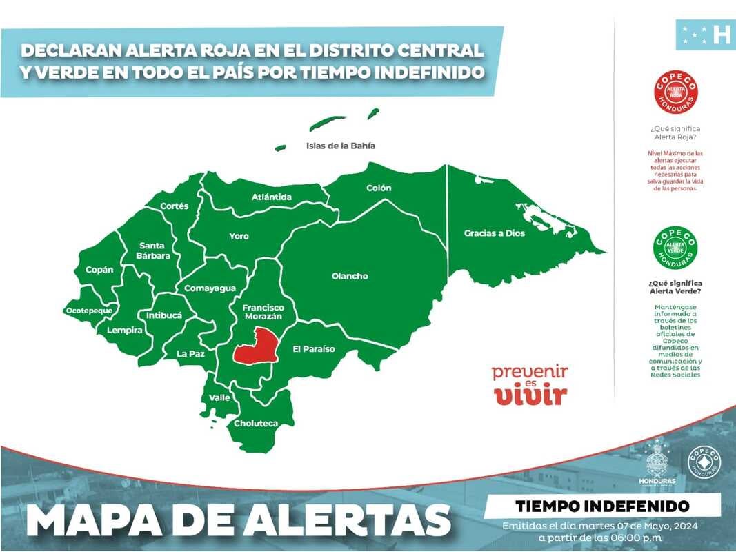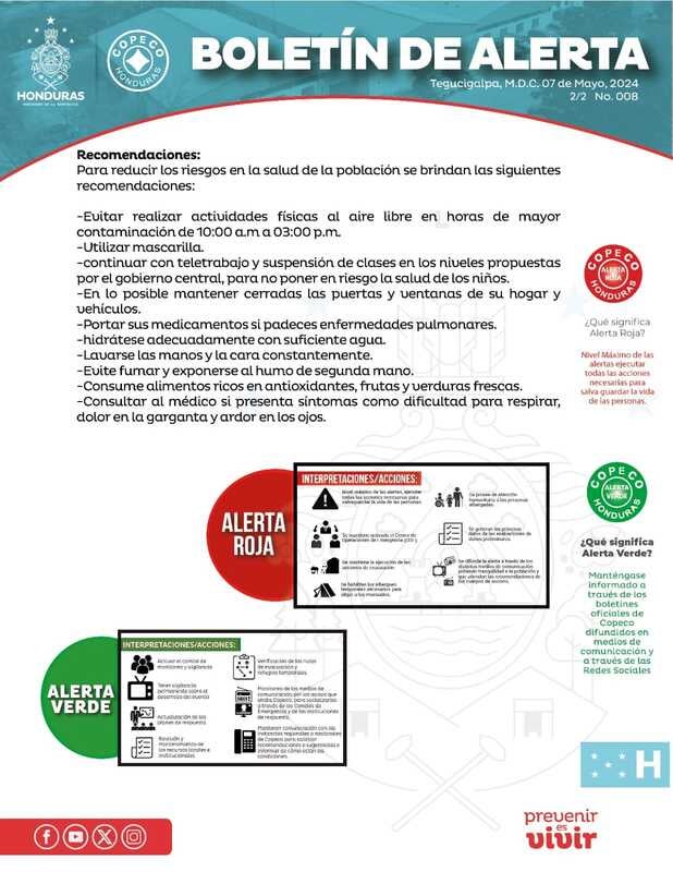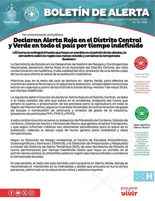 Redacción. Ante el alto nivel de contaminación que se percibe en el aire de Honduras, la Secretaría de Gestión de Riesgos y Contingencias Nacionales (Copeco) declaró este martes en alerta roja el municipio del Distrito Central, Francisco Morazán.