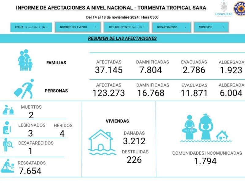 Redacción. La tormenta tropical Sara ha dejado un impacto devastador en Honduras, afectando a unas 123,273 personas a nivel nacional, según el más reciente informe de la Comisión Permanente de Contingencias (Copeco).