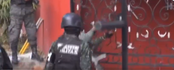 Con un ariete policial y sin presentar orden judicial, las fuerzas del orden derribaron el portón metálico de la vivienda.