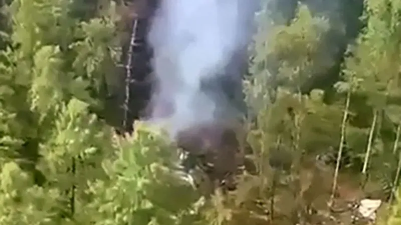En las imágenes se ve una columna de humo que se eleva en medio de numerosos árboles y llamas cerca de lo que parecen ser restos del aparato.