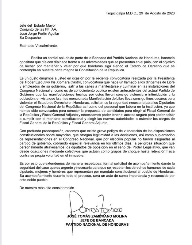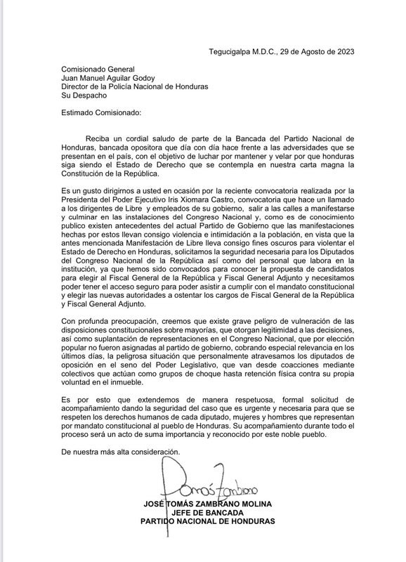 Mediante un carta pública dirigida a Juan Manuel Aguilar, director de la Policía Nacional, los nacionalistas pidieron la seguridad necesaria para su representantes. Asimismo, para quienes laboran dentro del hemiciclo.