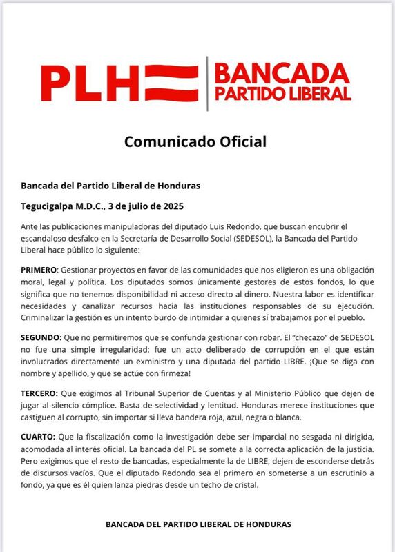 En un pronunciamiento público, los diputados liberales, encabezados por Jorge Cálix, respondieron a lo que calificaron como “publicaciones manipuladoras” de Luis Redondo, presidente del Congreso Nacional, a quien acusan de intentar desviar la atención del presunto desfalco ocurrido en Sedesol.