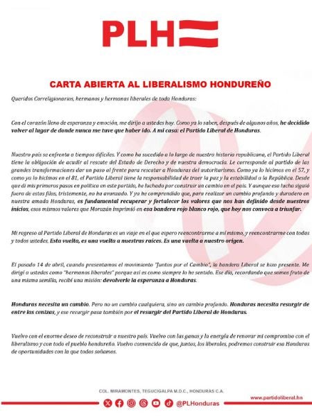 De la misma manera, el político hondureño dio lectura a una carta abierta, en la cual reiteró sus intenciones de regresar al lugar de donde «nunca tuve que haberme ido, a mi casa: el Partido Liberal de Honduras».