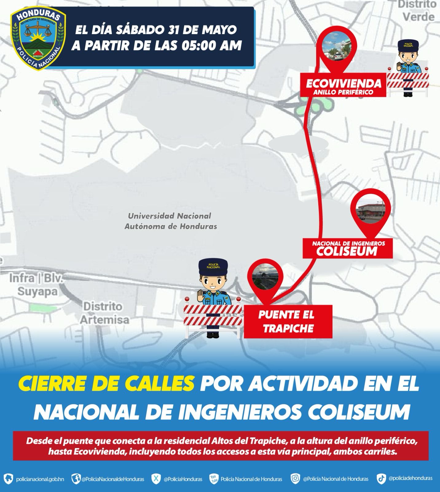 El evento se llevará a cabo en el Nacional de Ingenieros Coliseum, en Tegucigalpa. En este contexto, por razones logísticas y de seguridad, se ha dispuesto la interrupción del tránsito vehicular en un importante tramo del Anillo Periférico.