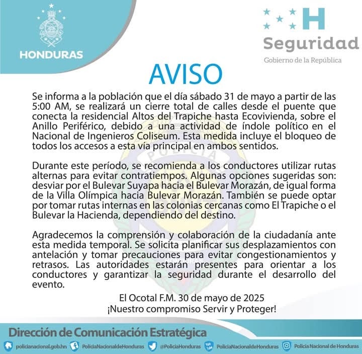 Redacción. La Dirección Nacional de Vialidad y Transporte (DNVT) informó que este sábado 31 de mayo se implementará un cierre total de calles a partir de las 5:00 de la mañana, con motivo de la realización de la asamblea nacional del Partido Libertad y Refundación (Libre).