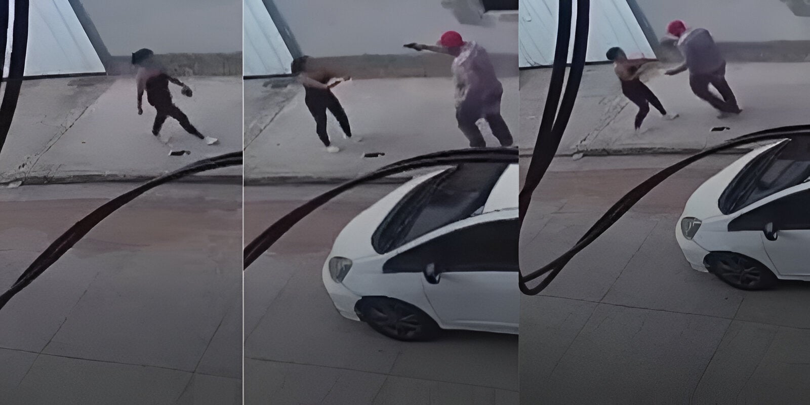 La víctima, claramente sorprendida y atemorizada, intenta alejarse mientras el agresor la encañona.