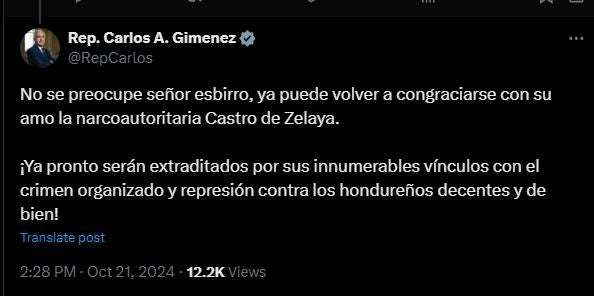 Ante la respuesta del canciller hondureño, el congresista republicano, Carlos Giménez, emitió un pronunciamiento en x, donde aseguró que pronto extraditarán a miembros del gobierno actual.