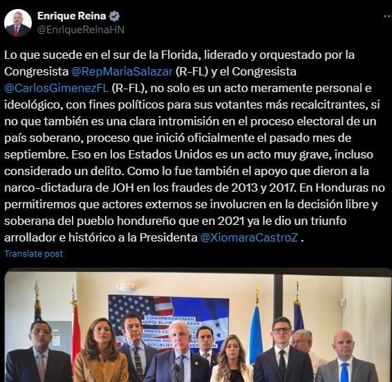 Redacción. Como una intromisión en el proceso electoral de una nación soberana como Honduras, tildó el canciller Enrique Reina la conferencia brindada por los congresistas republicanos de Florida y políticos hondureños.