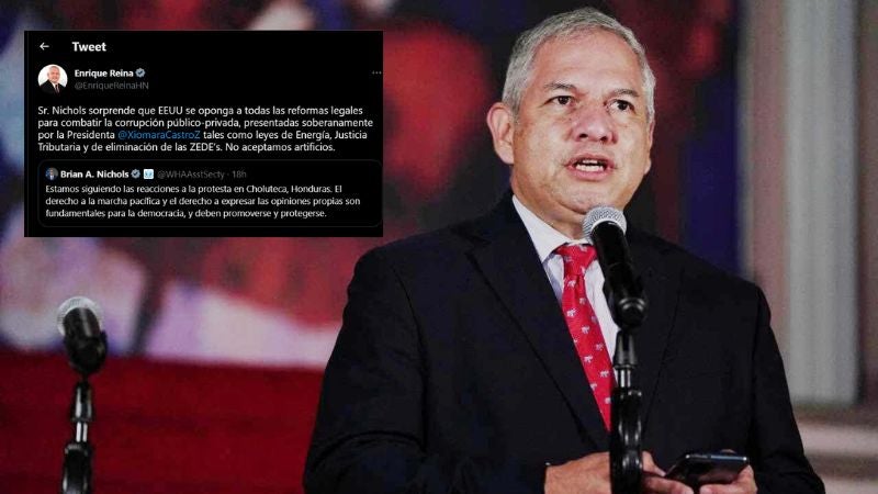 REDACCIÓN. El canciller de la República de Honduras, Enrique Reina, respondió al subsecretario de Asuntos del Hemisferio Occidental del Departamento de Estado de Estados Unidos, Brian A. Nichols, quien refirió que siguen de cerca las acciones del Gobierno hondureño en referencia a las manifestaciones de empleados de la agroindustria en Choluteca la semana pasada.