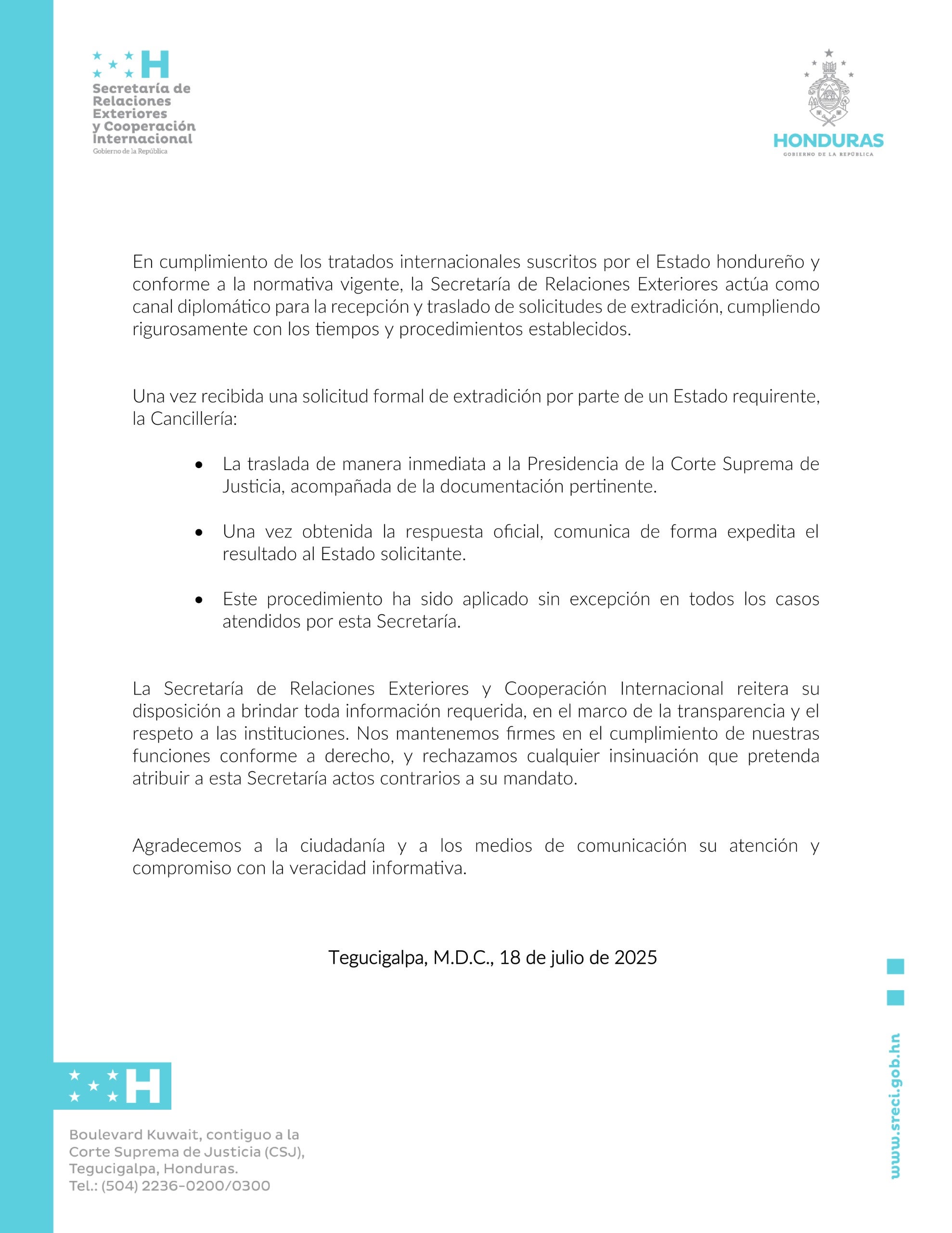 La institución recalcó que todas las peticiones formales de extradición que reciben se trasladan de forma inmediata a la Corte Suprema de Justicia (CSJ), acompañadas de la documentación correspondiente.
