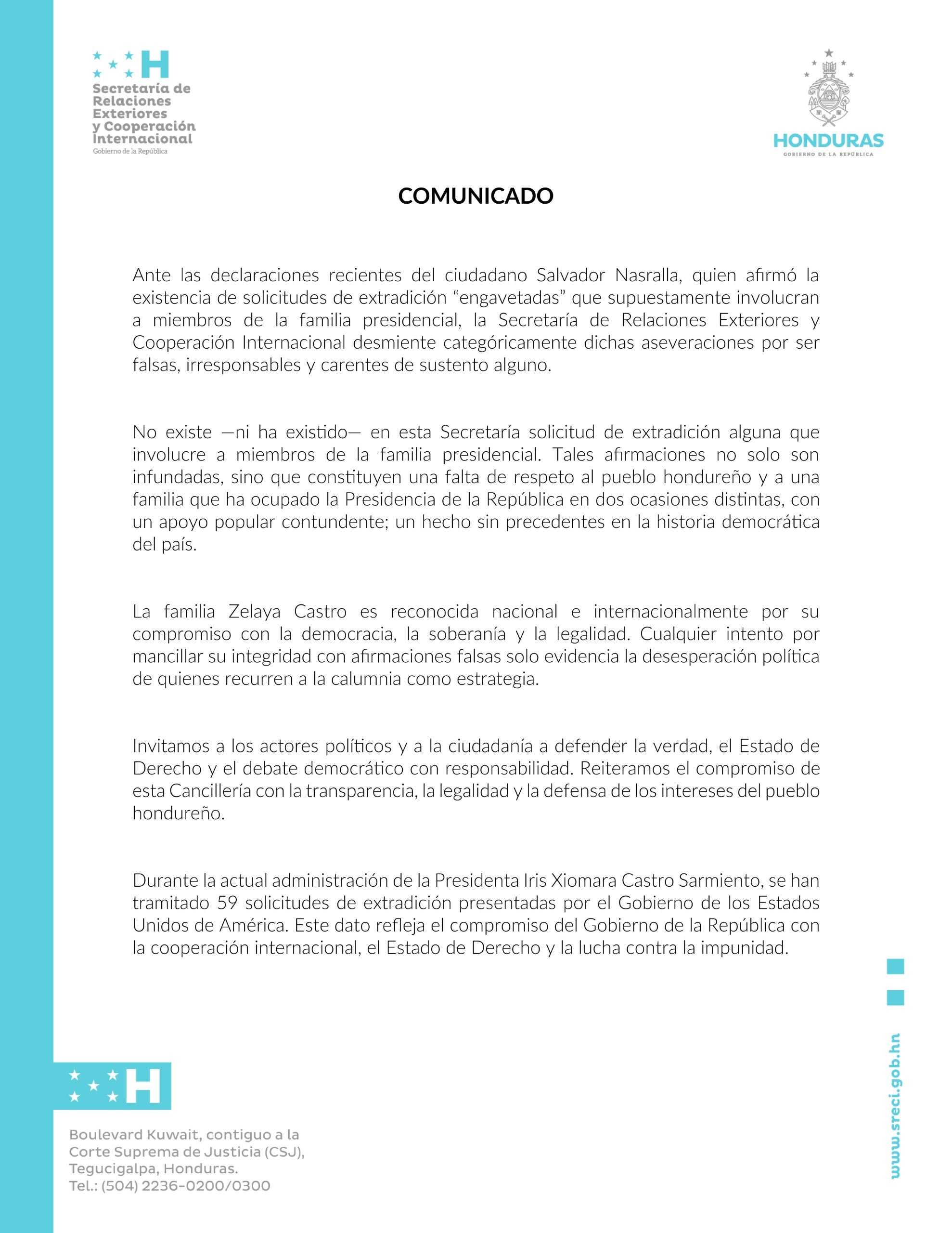 Redacción. La Secretaría de Relaciones Exteriores y Cooperación Internacional negó este jueves que existan solicitudes de extradición relacionadas con miembros de la cúpula del partido Libre, luego de declaraciones realizadas por el presidenciable Salvador Nasralla.