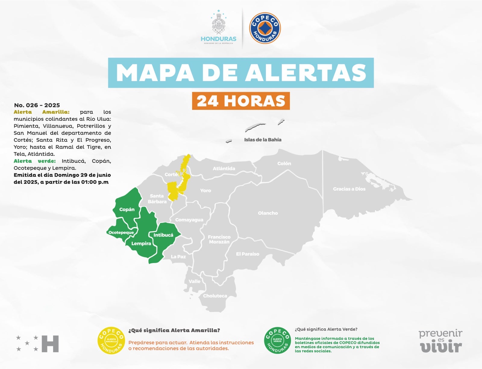 Redacción. La Secretaría de Gestión de Riesgos y Contingencias Nacionales (Copeco) informó este domingo que se mantiene la alerta amarilla en las zonas bajas de los municipios aledaños al caudaloso río Ulúa en el norte de Honduras.