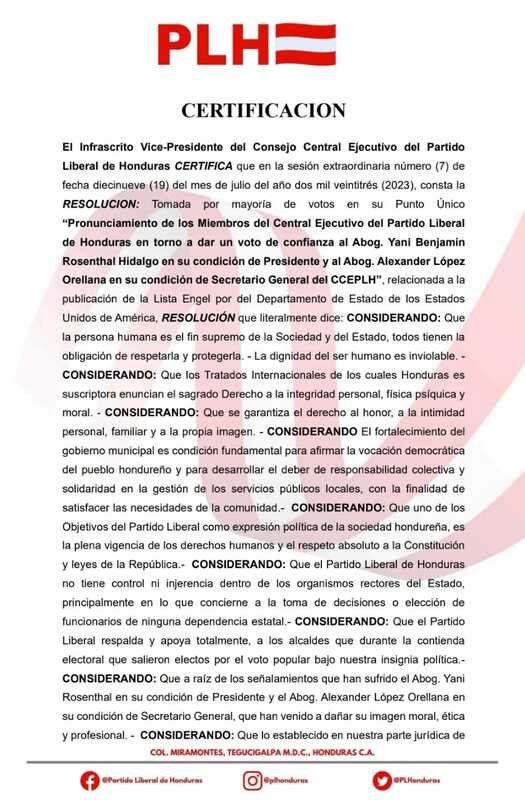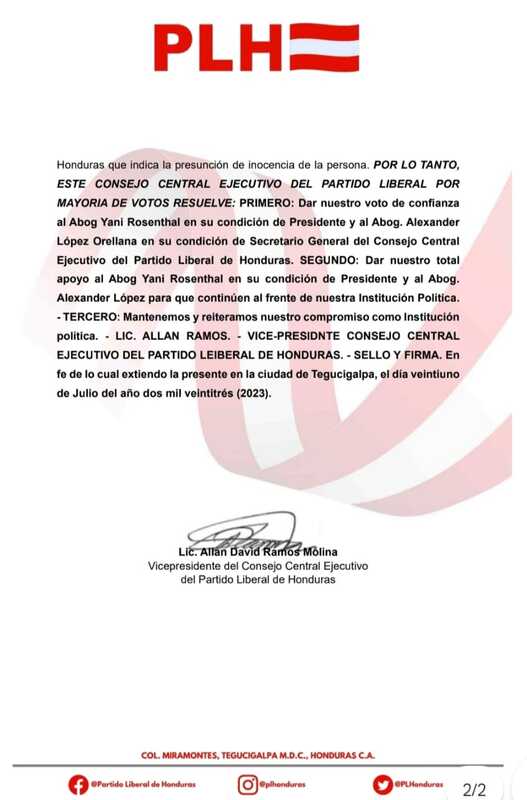 Tegucigalpa, Honduras.- El Consejo Central Ejecutivo del Partido Liberal (CCEPL) reafirmó, a través de un comunicado, su respaldo al presidente Yani Rosenthal y al secretario Alexander López, tras haber sido mencionados en la Lista Engel.
