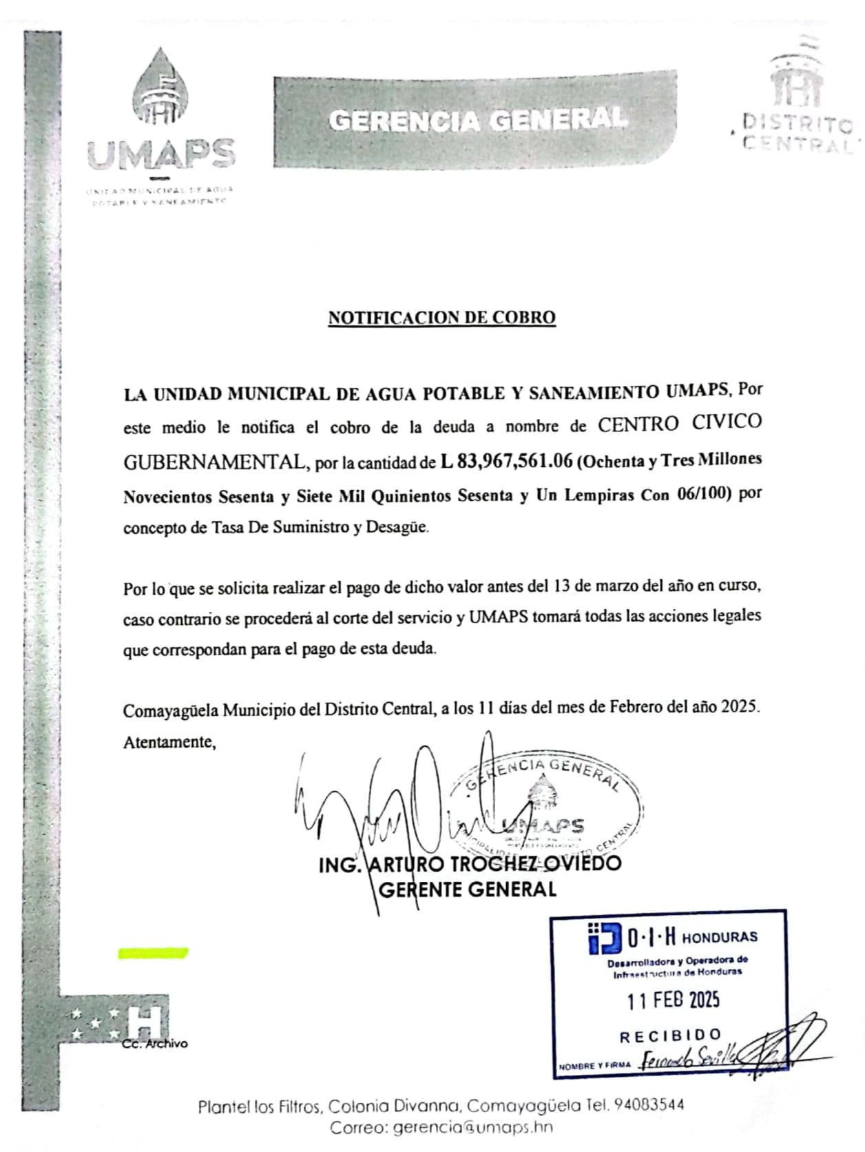 La UMAPS ha detallado que el complejo gubernamental adeuda L 83,967,561.06 en concepto de Tasas de Suministro y Desagüe, sin que hasta la fecha se haya mostrado voluntad de pago por parte del operador del edificio.