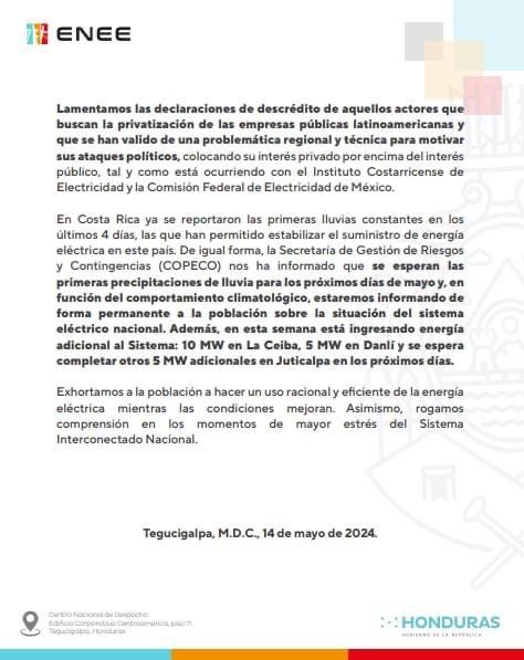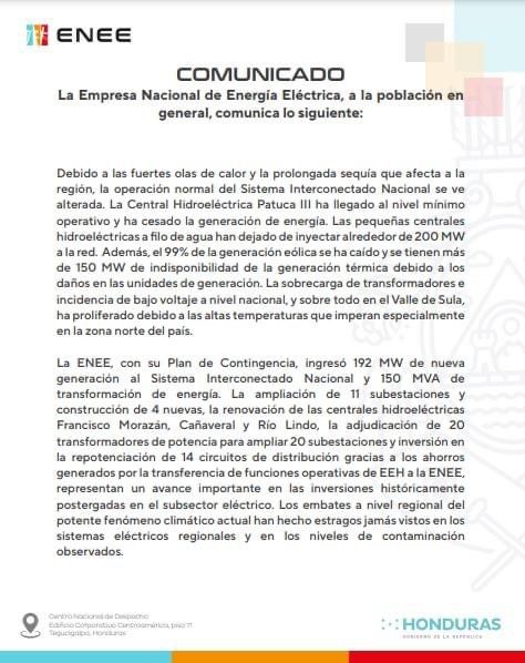 «Estaremos informando de forma permanente a la población sobre la situación del sistema eléctrico nacional. Además, en esta semana está ingresando energía adicional: 10 MW en La Ceiba, 5 MW en Danlí y se espera completar otros 5 MW adicionales en Juticalpa en los próximos días», explicó el documento.