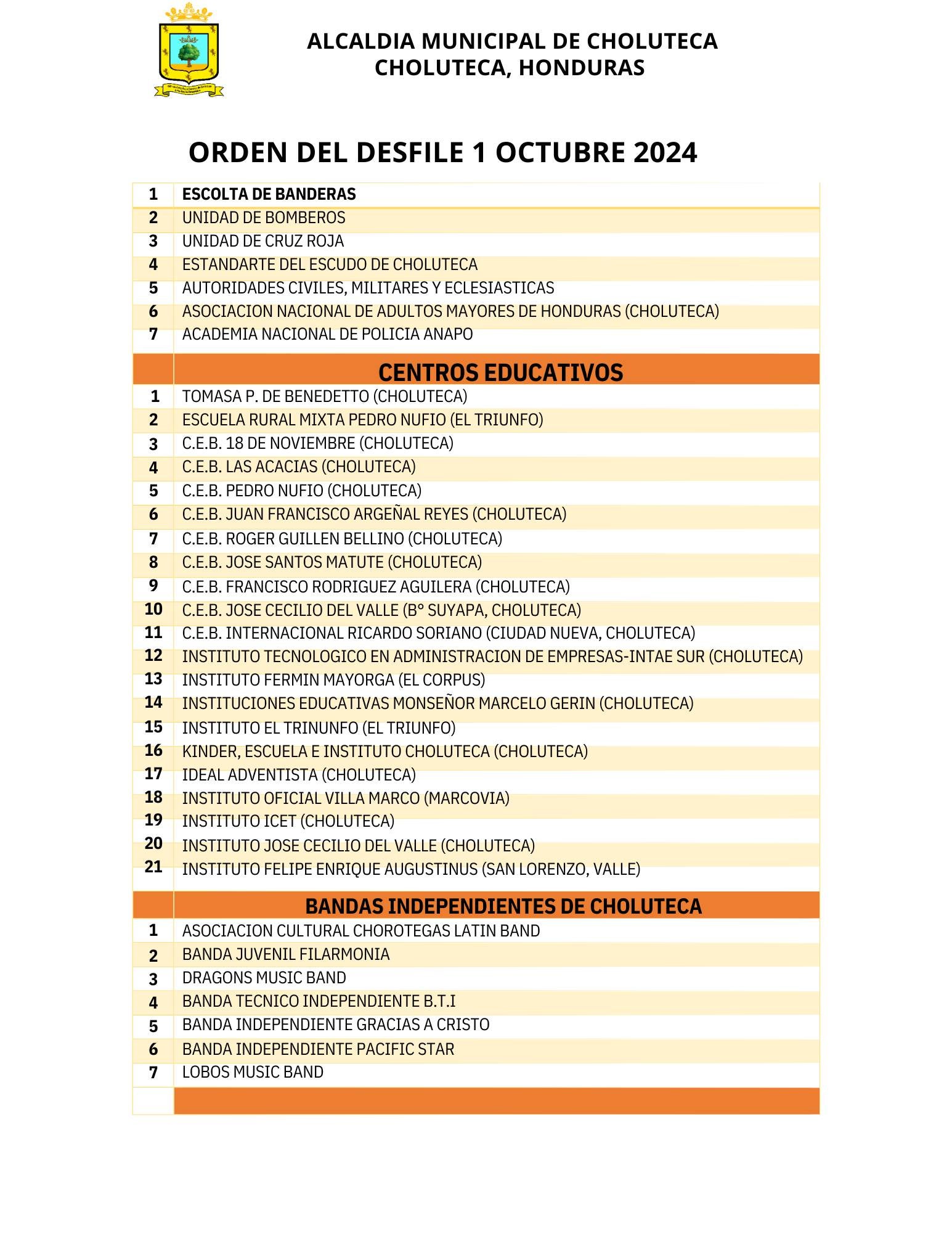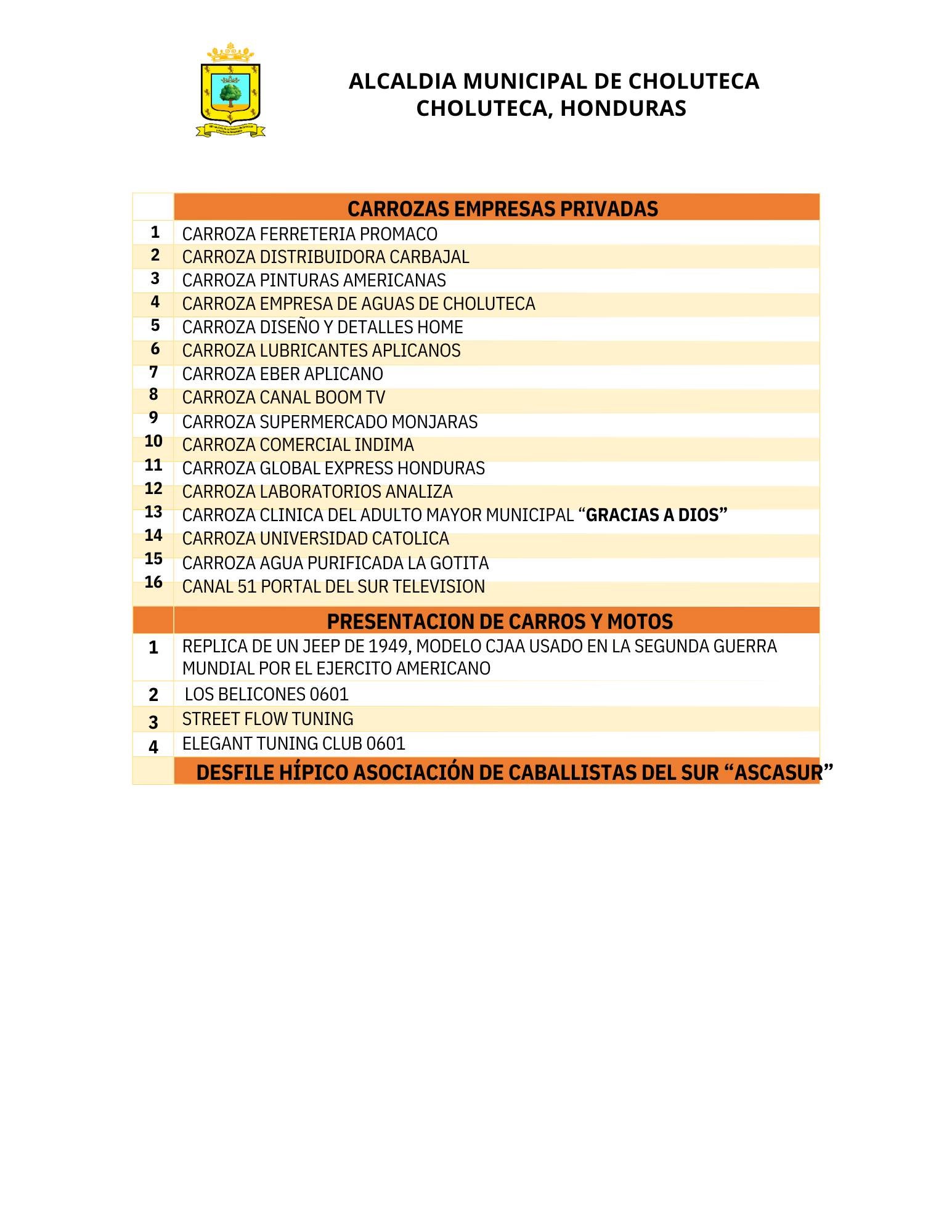 Posterior a ello se contará con la participación de 7 bandas independientes de Choluteca, 16 carrozas de empresas privadas y presentación de carros y motos. Finalmente, se realizará el desfile hípico de la Asociación de Caballistas del Sur «ASCASUR».