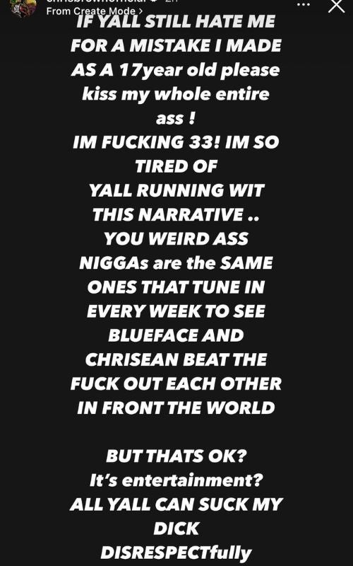 “Tengo 33, estoy tan cansado de que todos sigan con esa narrativa. Ustedes son los mismos que se sintonizan todas las semanas para ver a Blueface y Chrisean golpearse el uno al otro”, agregó en sus Instagram Stories.