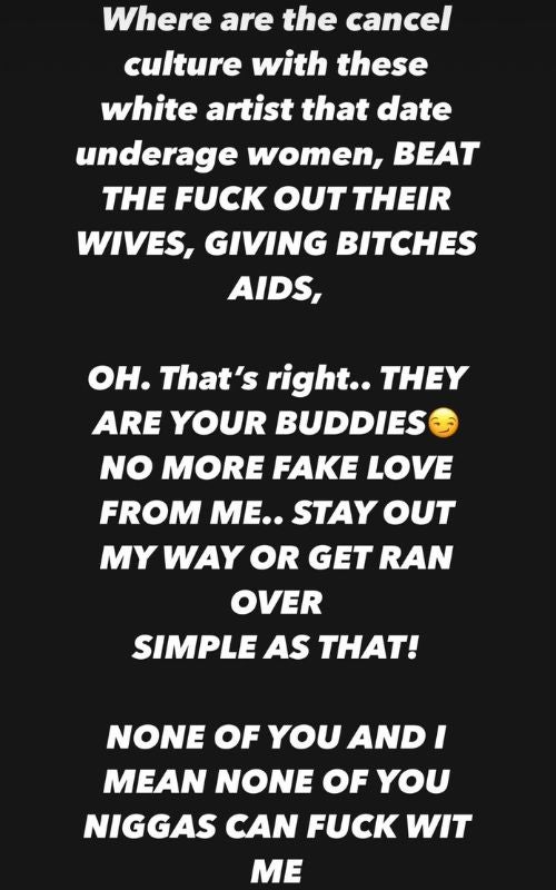 El cantante también cuestionó dónde estaba esta “cultura de la cancelación” cuando se trataba de “artistas blancos” que “salían con mujeres menores de edad” o “golpeaban a sus esposas”.