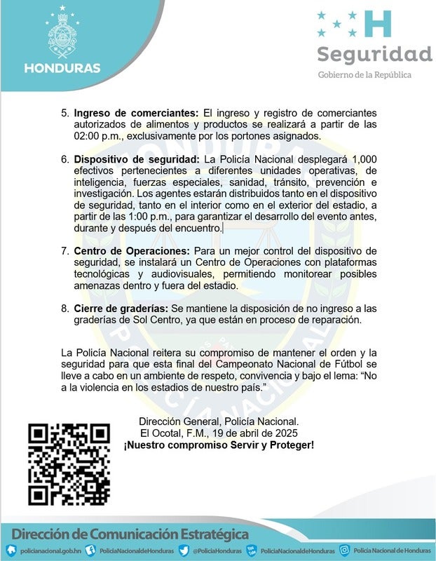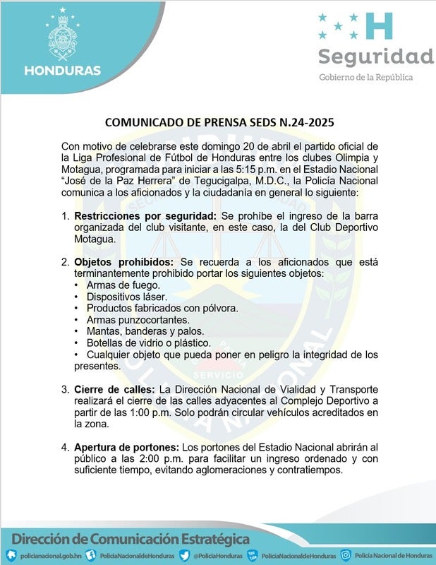 Asimismo, se prohibió el ingreso de la barra organizada del Club Deportivo Motagua, el club visitante en este caso.