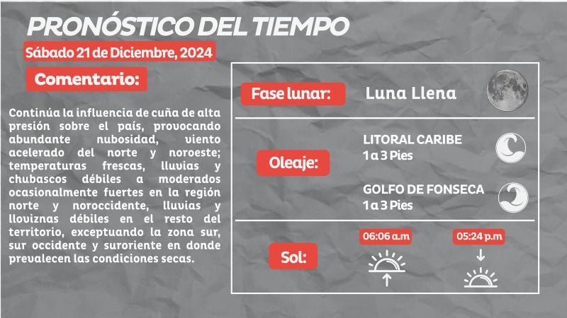 Cenaos explicó que seguirá la influencia de la cuña de alta presión sobre el país, produciendo condiciones nubosas, viento acelerado del norte y noreste; temperaturas frescas, lluvias y chubascos débiles a moderados ocasionalmente fuertes en la región norte y noroccidente.