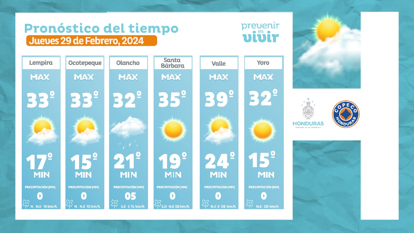 - Olancho: 32° como máxima, 21° como mínima (05 milímetros).