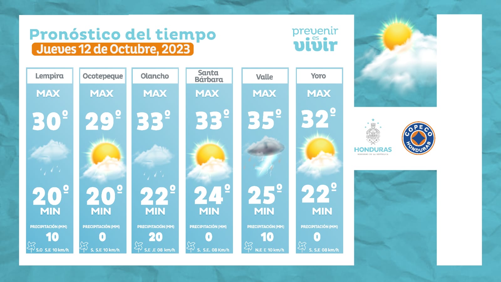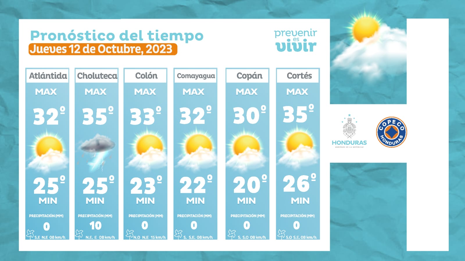 Honduras. Las autoridades del Centro de Estudios Atmosféricos, Oceanográficos y Sismológicos (CENAOS), mediante sus redes sociales, informaron que este jueves 12 de octubre habrá lluvias débiles en varios sectores del territorio nacional.