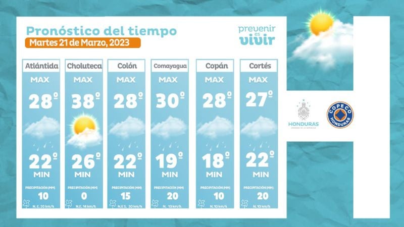 - La Ceiba: 28° como máximo, 22° como mínimas (10 milímetros)