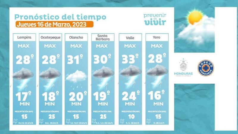 - Olancho: 31° como máxima, 20° como mínimas (15 milímetros)