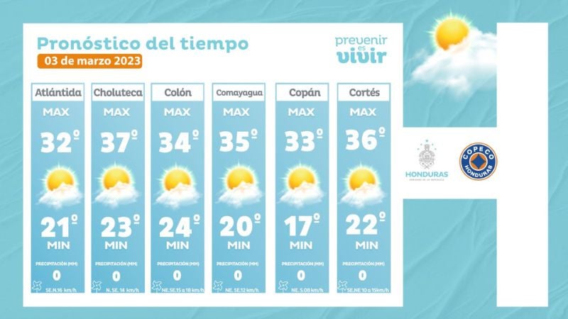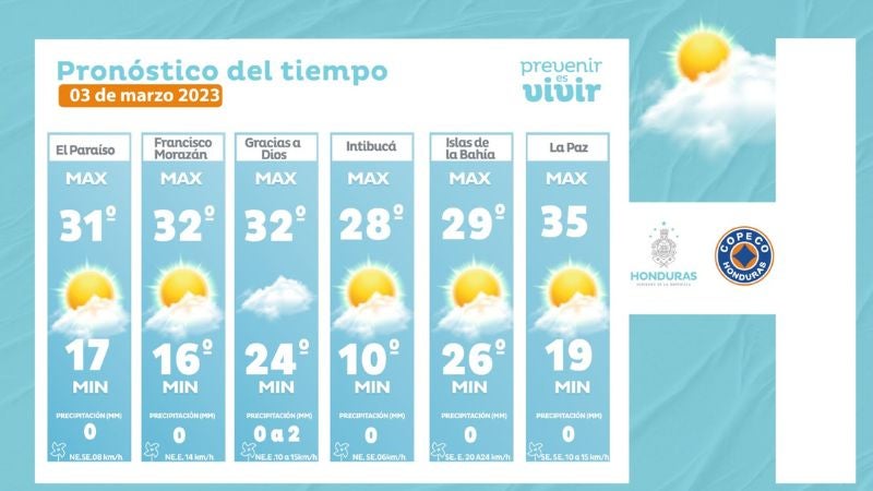 - Olancho: 32° como máxima, 20° como mínimas (0 a 2 milímetros)