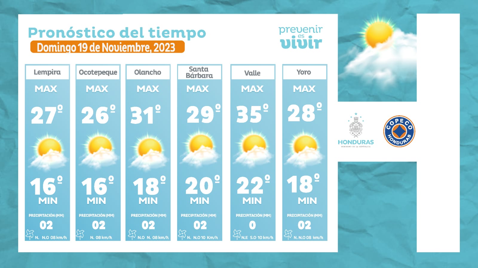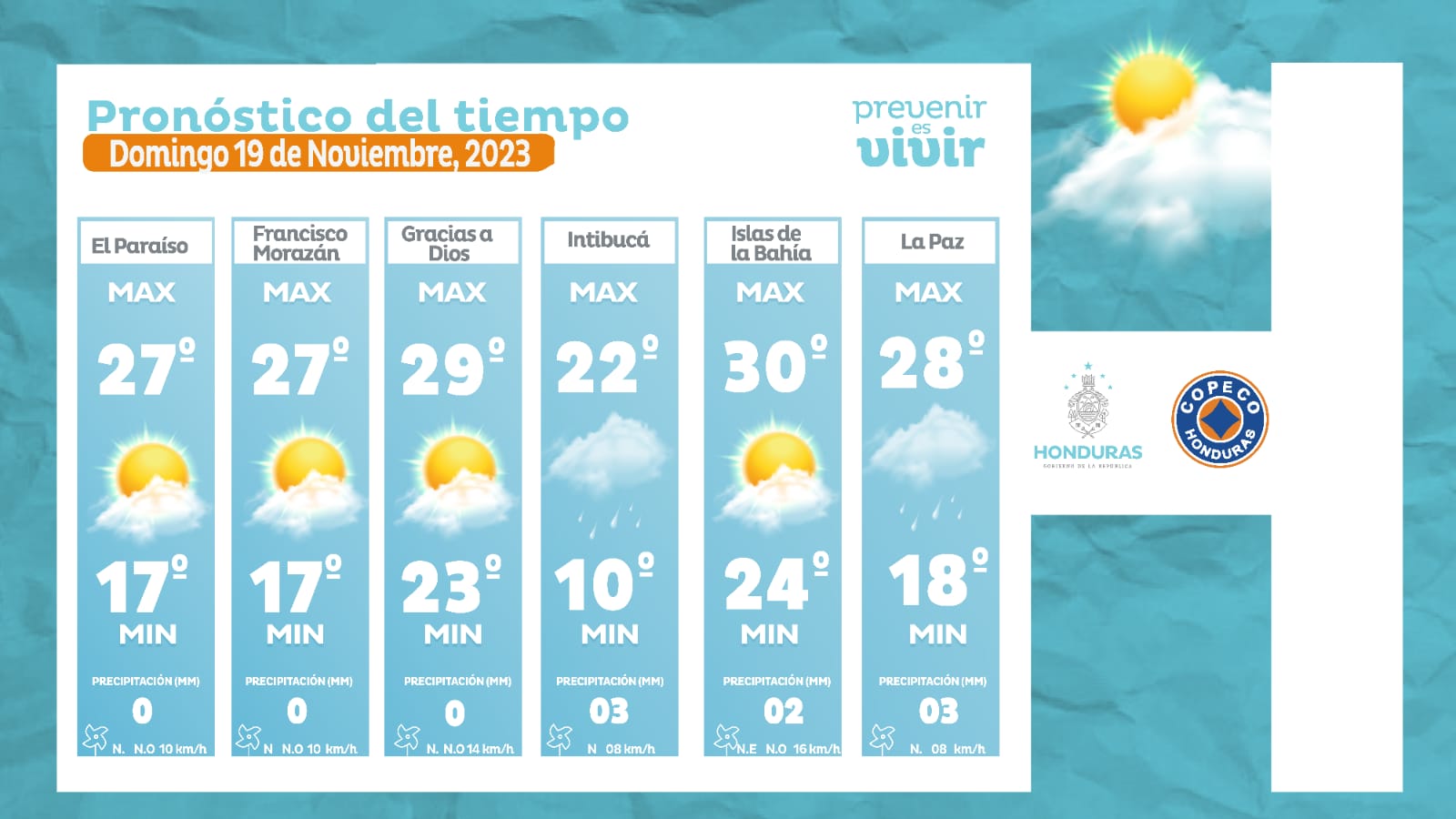 - Comayagua: 28° como máximo, 19° como mínimas (0 milímetros)