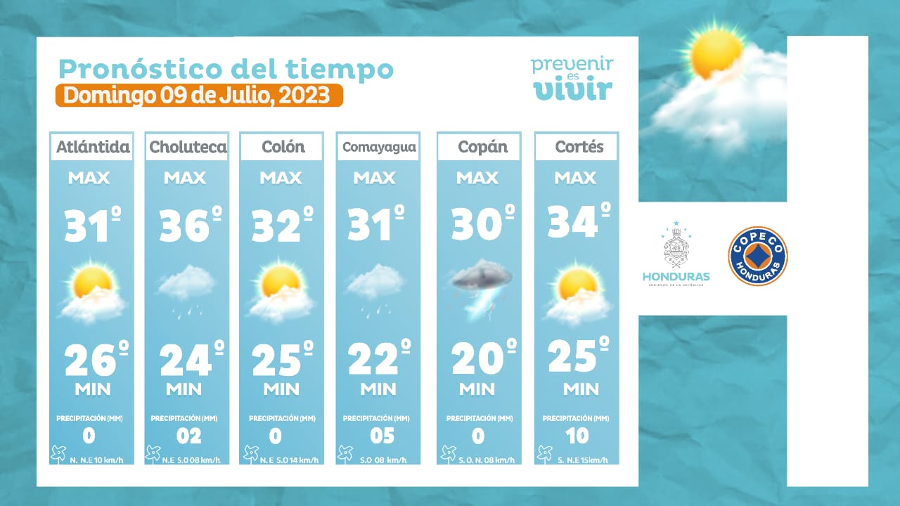 - Choluteca: 34° como máximo, 24° como mínimas (20 milímetros)