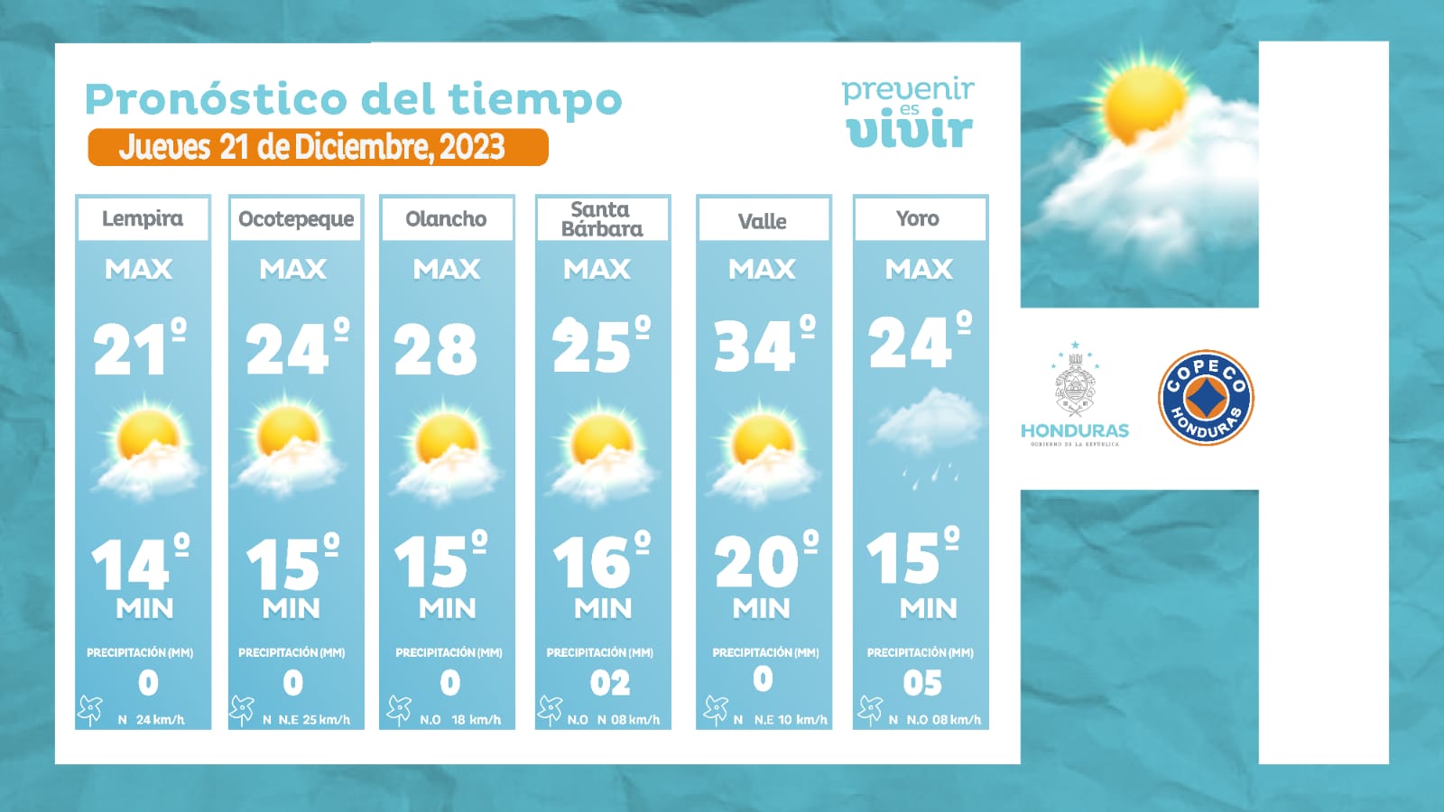 - Lempira: 21° grados como máxima, 14° como mínima (0 milímetros).