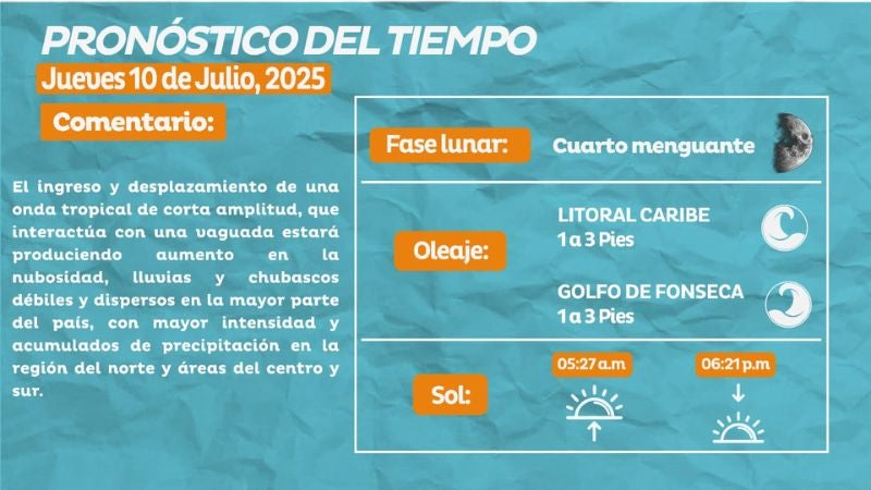 Clima. El Centro Nacional de Estudios Atmosféricos, Oceanográficos y Sísmicos (Cenaos) informó, a través de sus canales oficiales, el pronóstico meteorológico para este jueves 10 de julio de 2025.