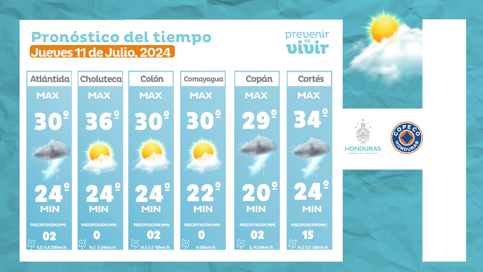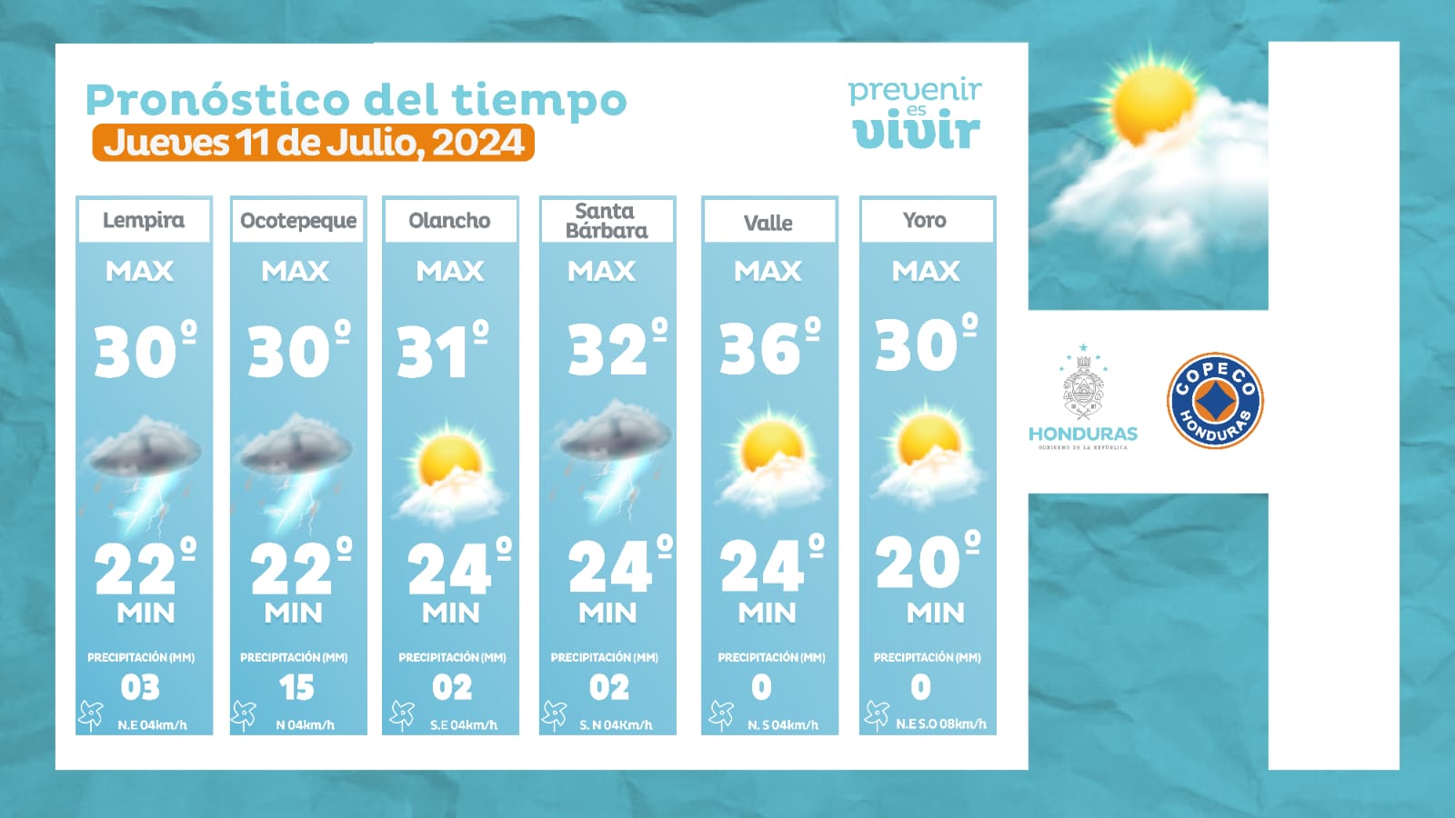 Clima. Para este jueves 11 de julio, el Centro Nacional de Estudios Atmosféricos, Oceanográficos y Sísmicos (CENAOS) pronosticó lluvias y chubascos débiles a moderados en la mayor parte del territorio hondureño producto del transporte de humedad proveniente desde el mar Caribe.