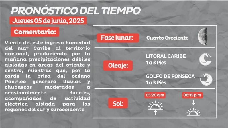 Clima. El Centro Nacional de Estudios Atmosféricos, Oceanográficos y Sísmicos (Cenaos) informó el pronóstico del clima para este jueves 5 de junio de 2025, a través de sus canales oficiales.