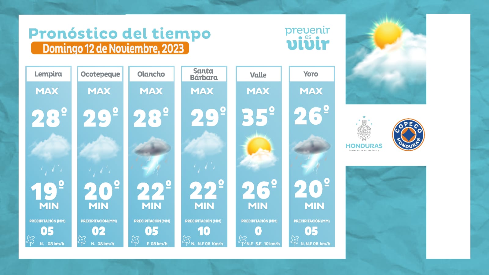 - Choluteca: 34° como máximo, 26° como mínimas (0 milímetros)
