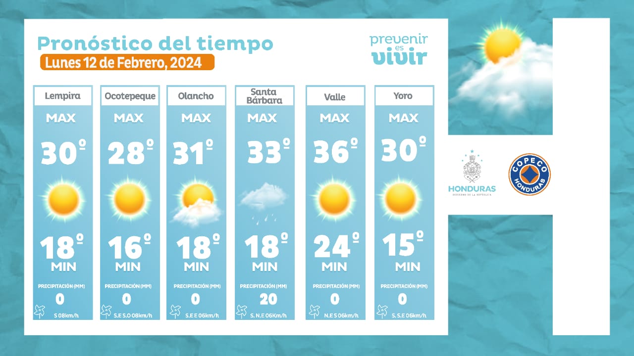 Honduras. El Centro Nacional de Estudios Atmosféricos, Oceanográficos y Sísmicos (CENAOS) informó que este lunes 12 de febrero continuarán las temperaturas secas en la mayor parte del territorio nacional.