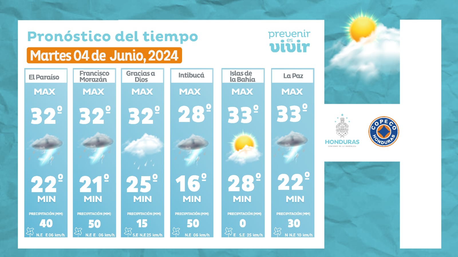 - Olancho: 33° como máxima, 24° como mínimas (60 milímetros)