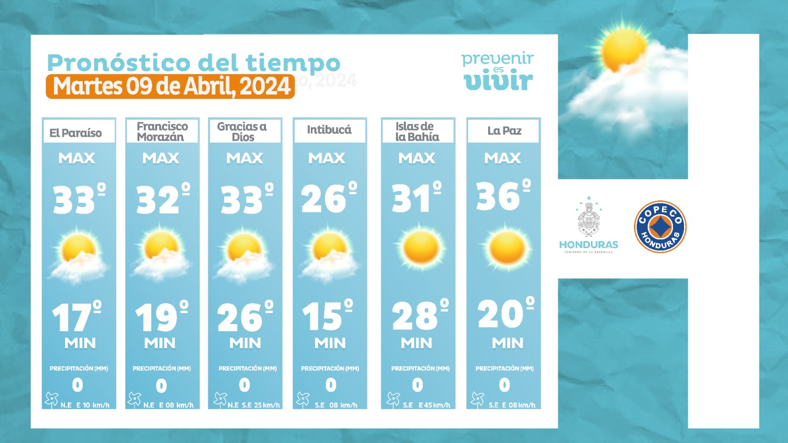 CLIMA. El Centro Nacional de Estudios Atmosféricos, Oceanográficos y Sísmicos (CENAOS) informó que este martes 9 de abril imperarán las condiciones secas en la mayor parte del territorio nacional, con mínimas posibilidades de lluvias en algunos sectores.