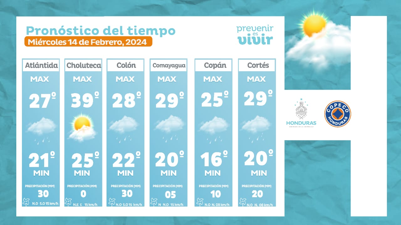 Asimismo, se podrían generar lluvias y lloviznas débiles y aisladas en el occidente, centro y oriente. Los mayores acumulados se registrarán en las montañas del norte y noroccidente de Honduras.