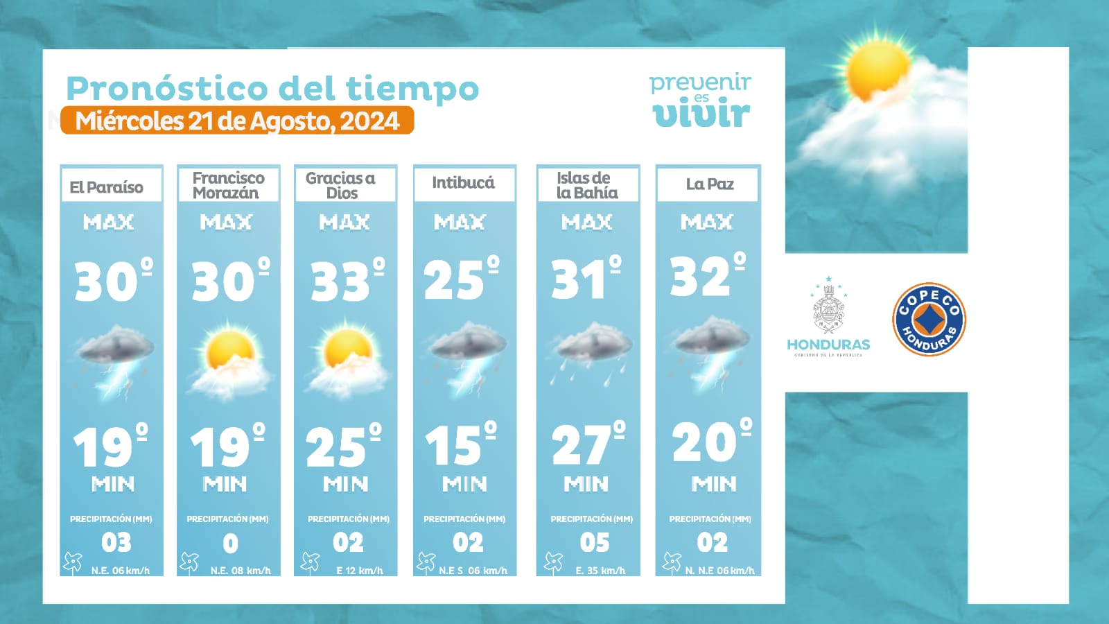Redacción. Para este miércoles 21 de agosto de 2024, el Centro Nacional de Estudios Atmosféricos, Oceanográficos y Sísmicos (Cenaos) pronosticó lluvias en la mayor parte de Honduras.