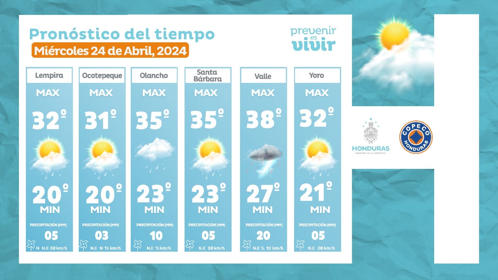 Honduras. Para hoy miércoles 24 de abril, el Centro Nacional de Estudios Atmosféricos, Oceanográficos y Sísmicos (CENAOS) informó que imperarán las condiciones lluviosas en la mayor parte del territorio nacional.