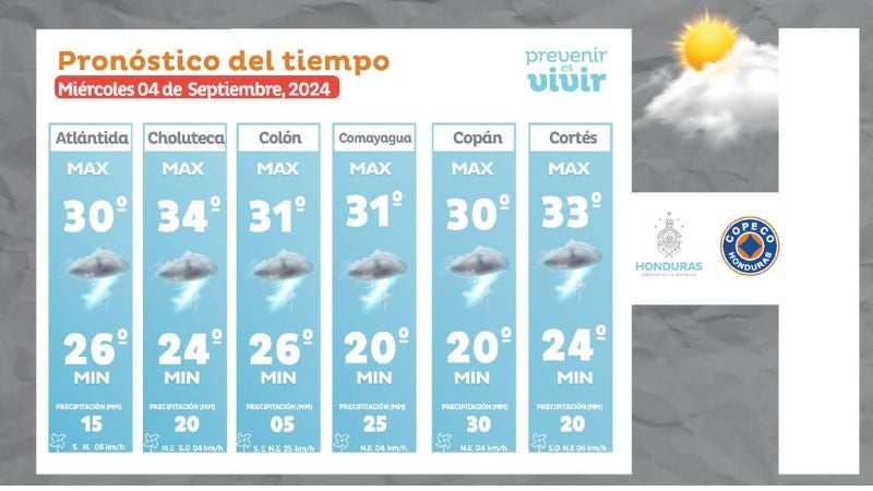 Redacción. Lluvias y chubascos con actividad eléctrica en la mayor parte del país se prevén como condiciones del clima para este miércoles 4 de septiembre del 2024, de acuerdo al Centro de Estudios Atmosféricos, Oceanográficos y Sísmicos (Cenaos).