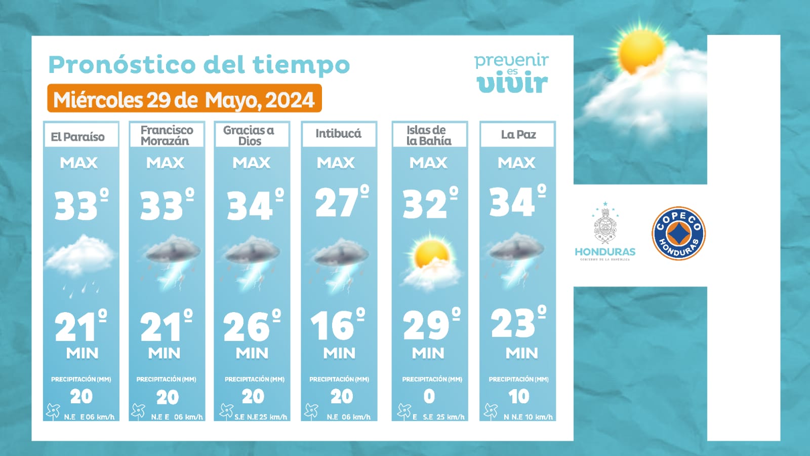 - La Ceiba: 34° como máximo, 25° como mínima (03 milímetros).
