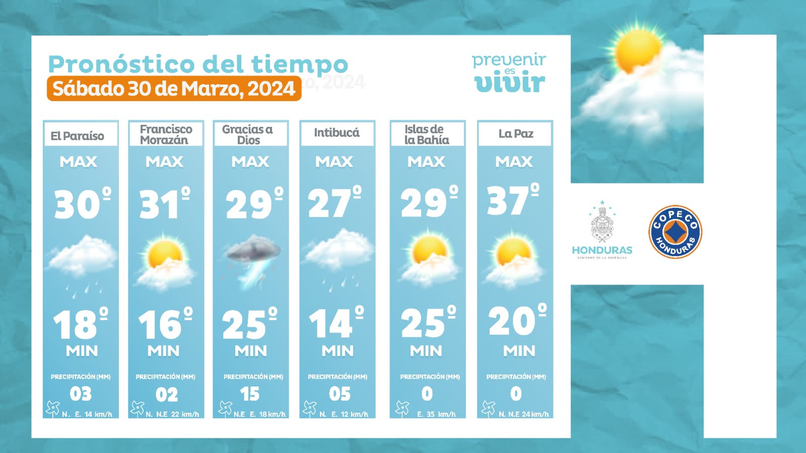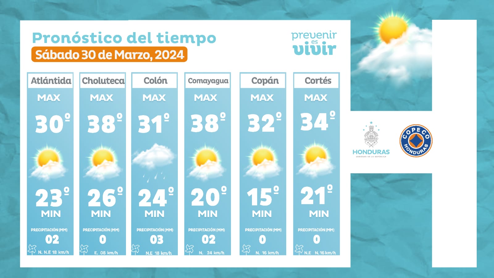 - La Ceiba: 30° como máximo, 23° como mínima (02 milímetros).