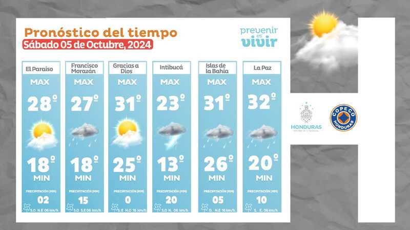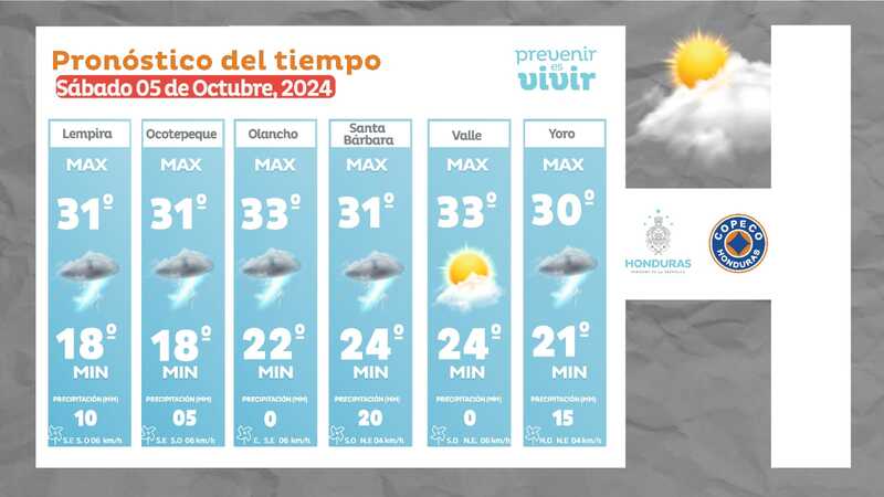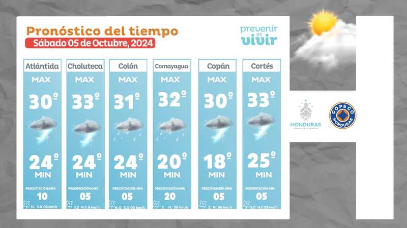 Clima. Para este sábado 05 de octubre de 2024, el Centro Nacional de Estudios Atmosféricos, Oceanográficos y Sísmicos (Cenaos) pronosticó un clima seco para la mayor parte de Honduras.